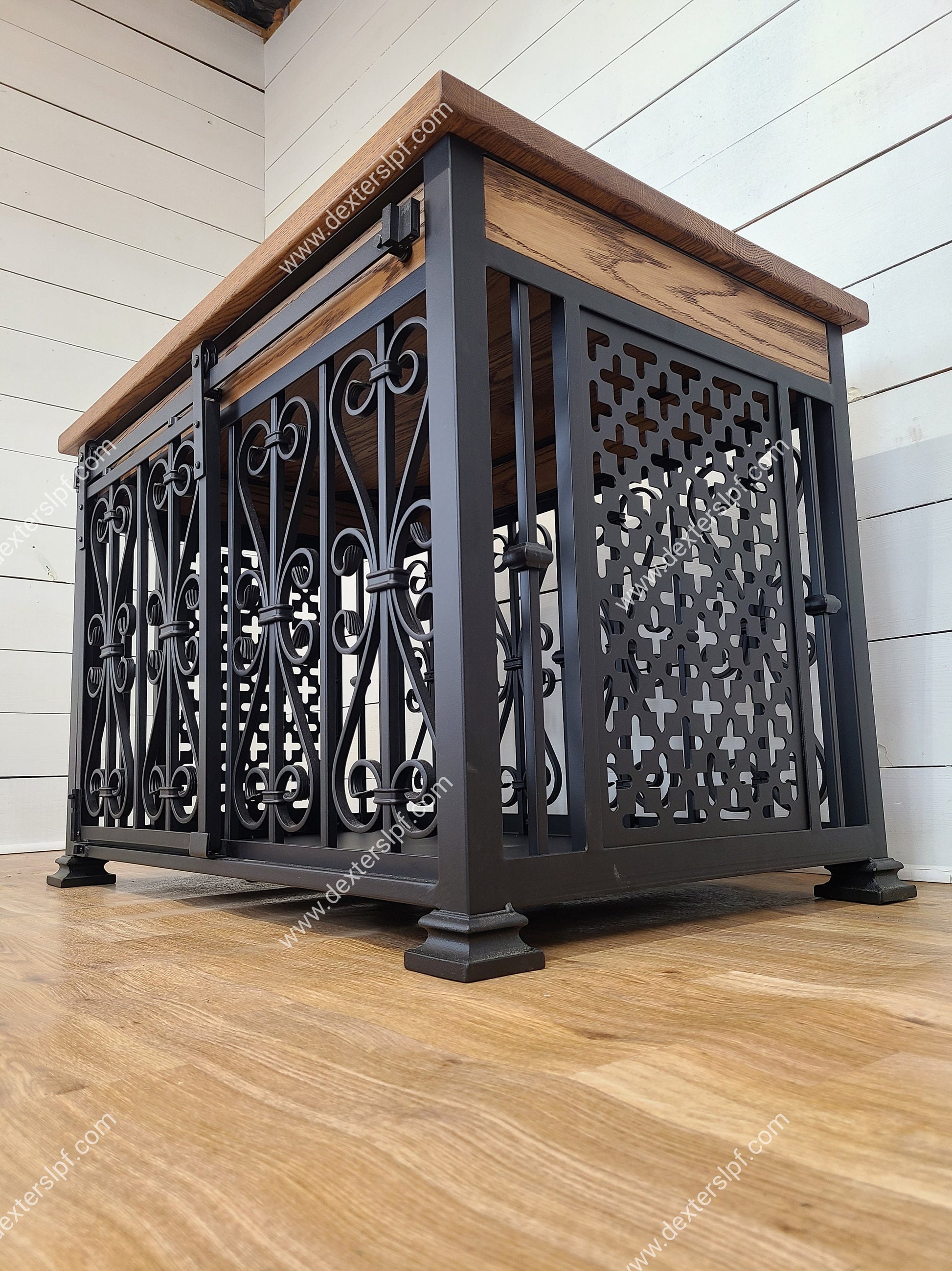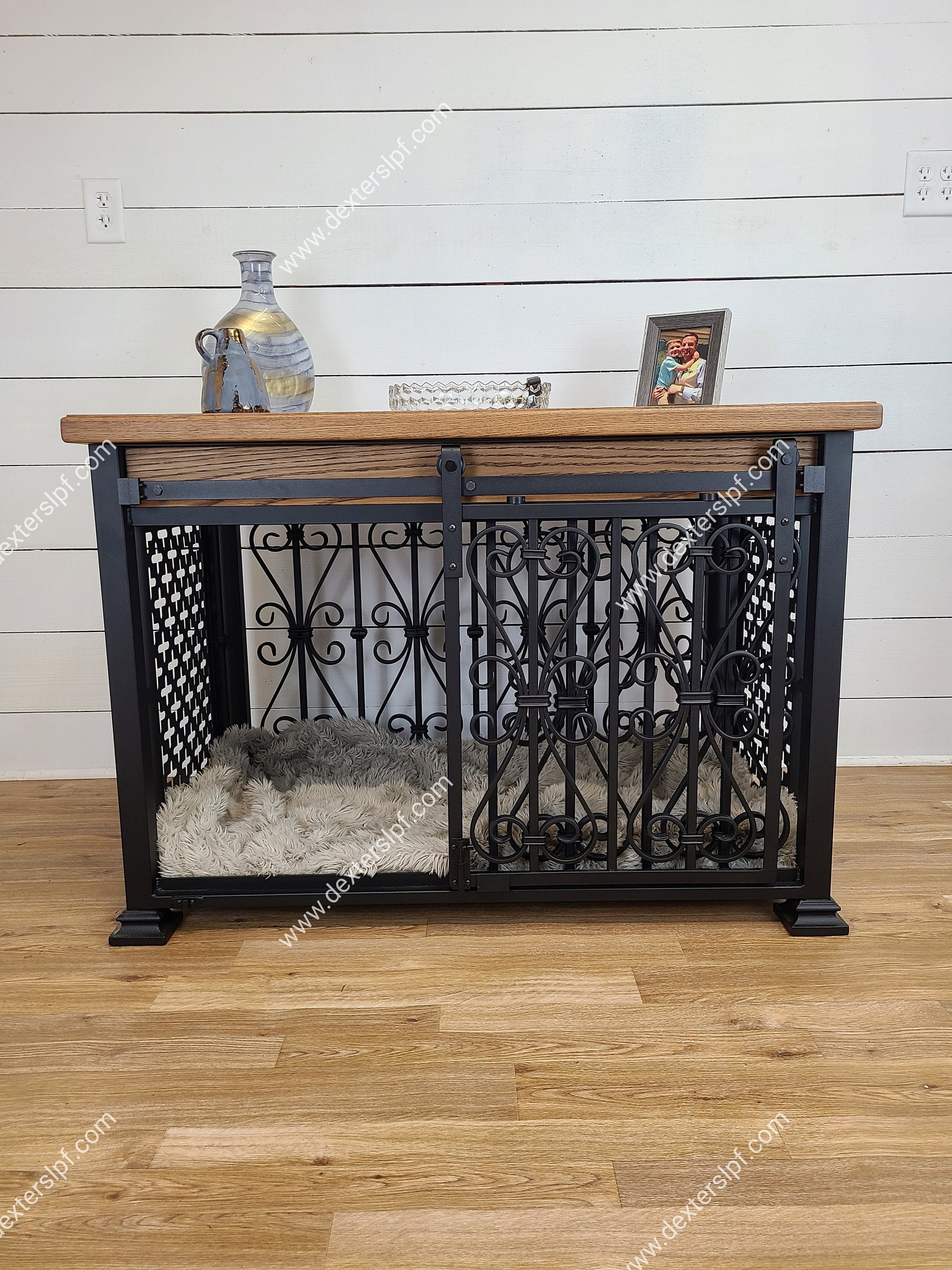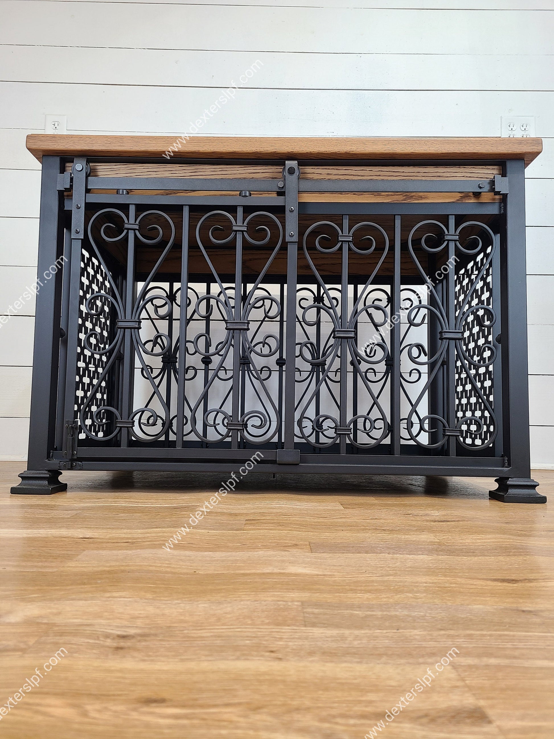 Introducing the Bella Large Dog Crate with Sliding Door—a luxurious statement piece that will undoubtedly be the topic of conversation during your next gathering with friends and family. This opulent dog crate furniture features an old-world aesthetic, highlighted by elegantly crowned forged steel scroll pickets.