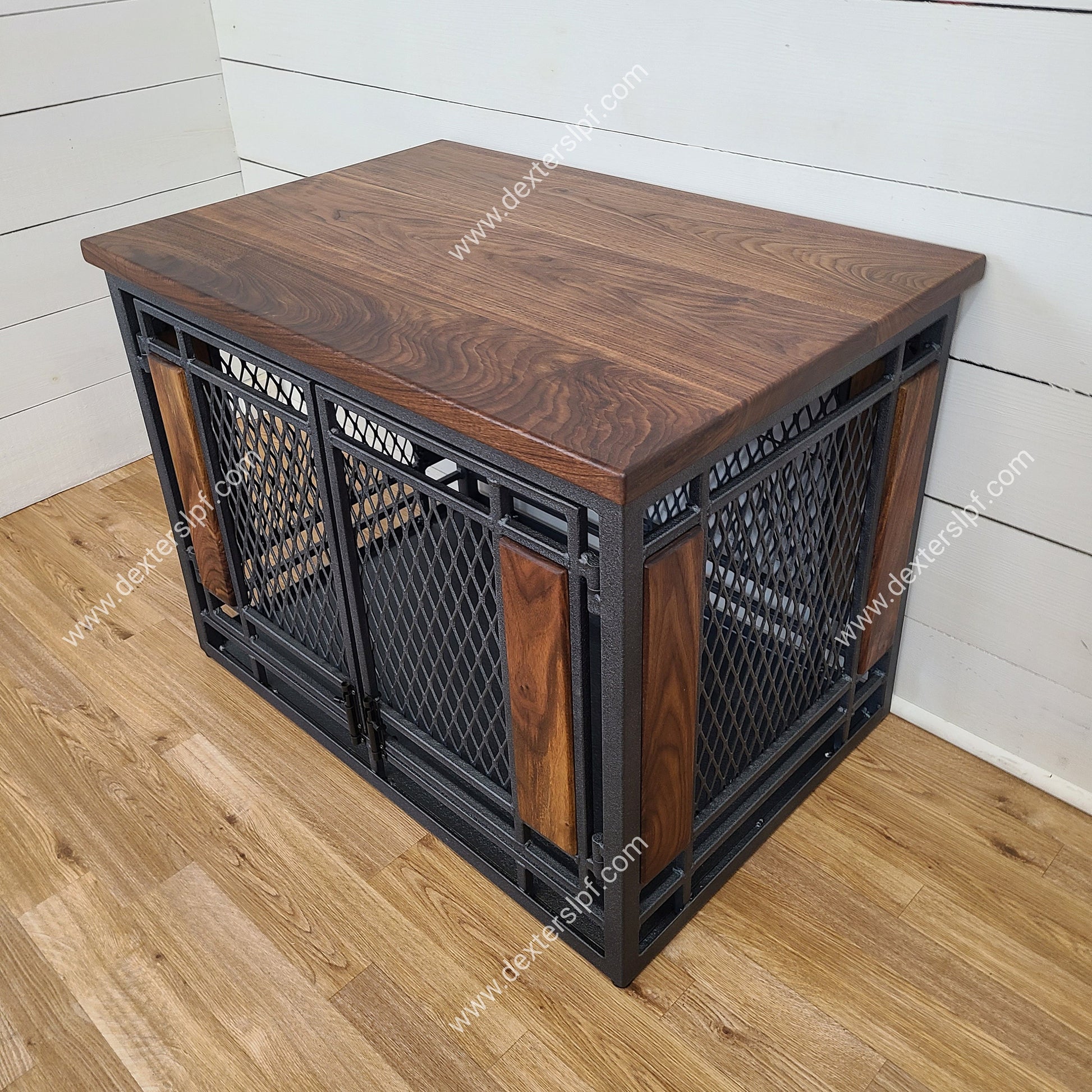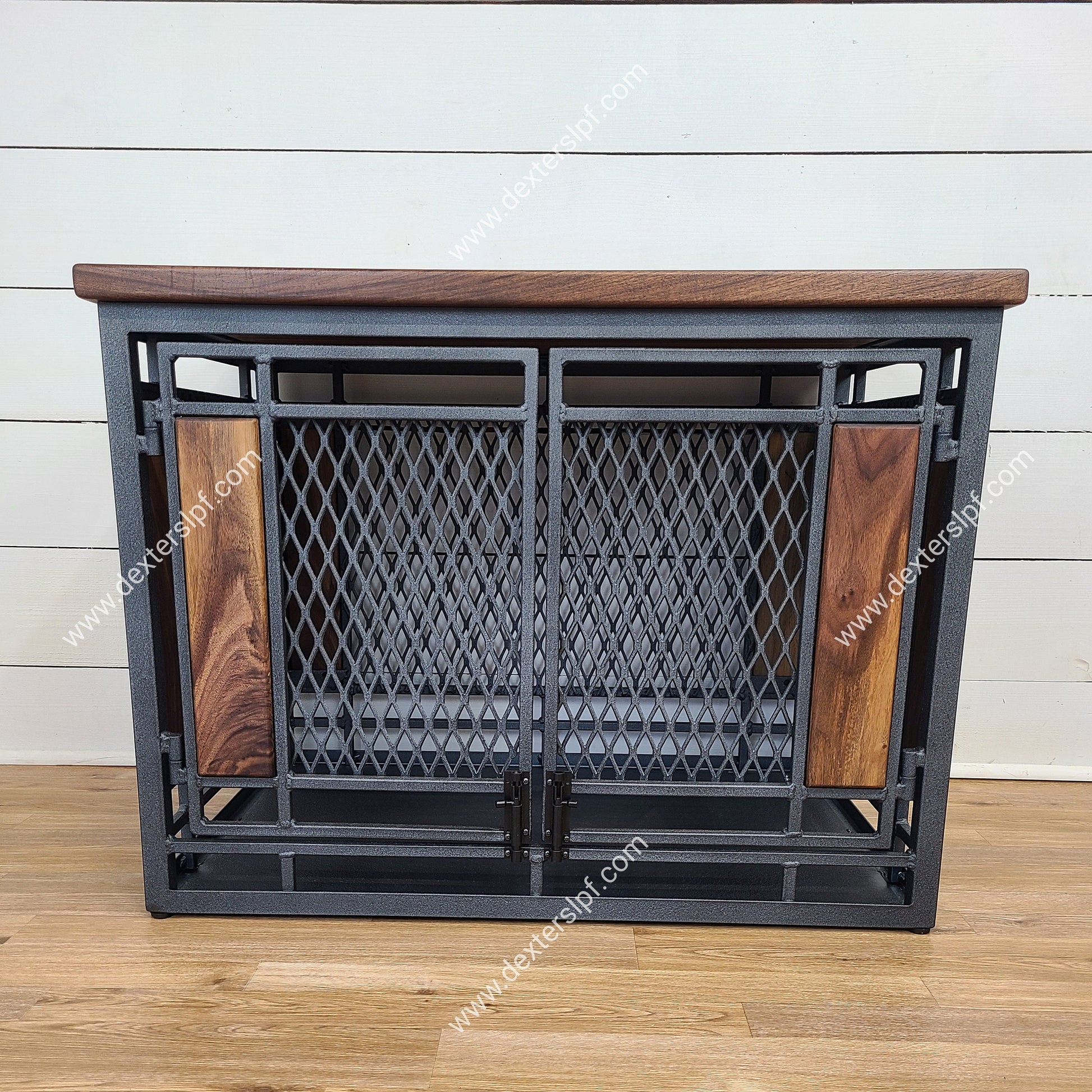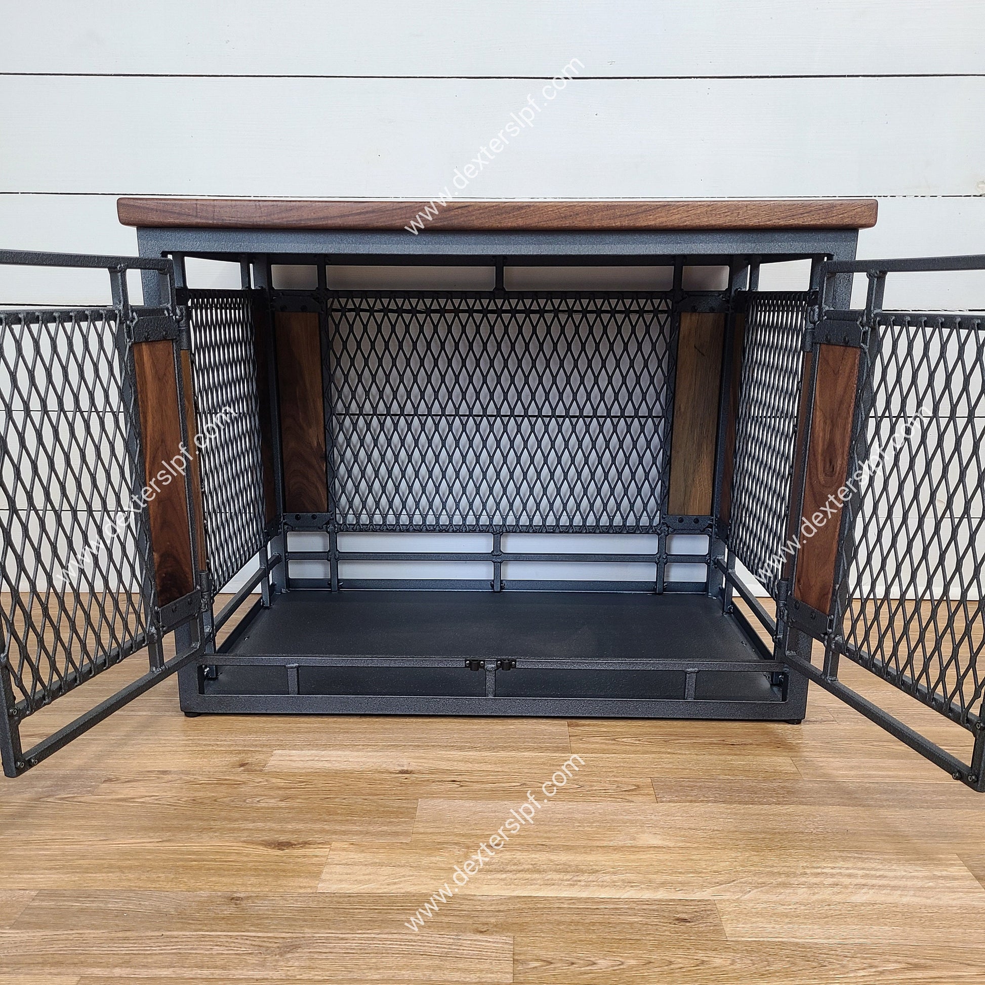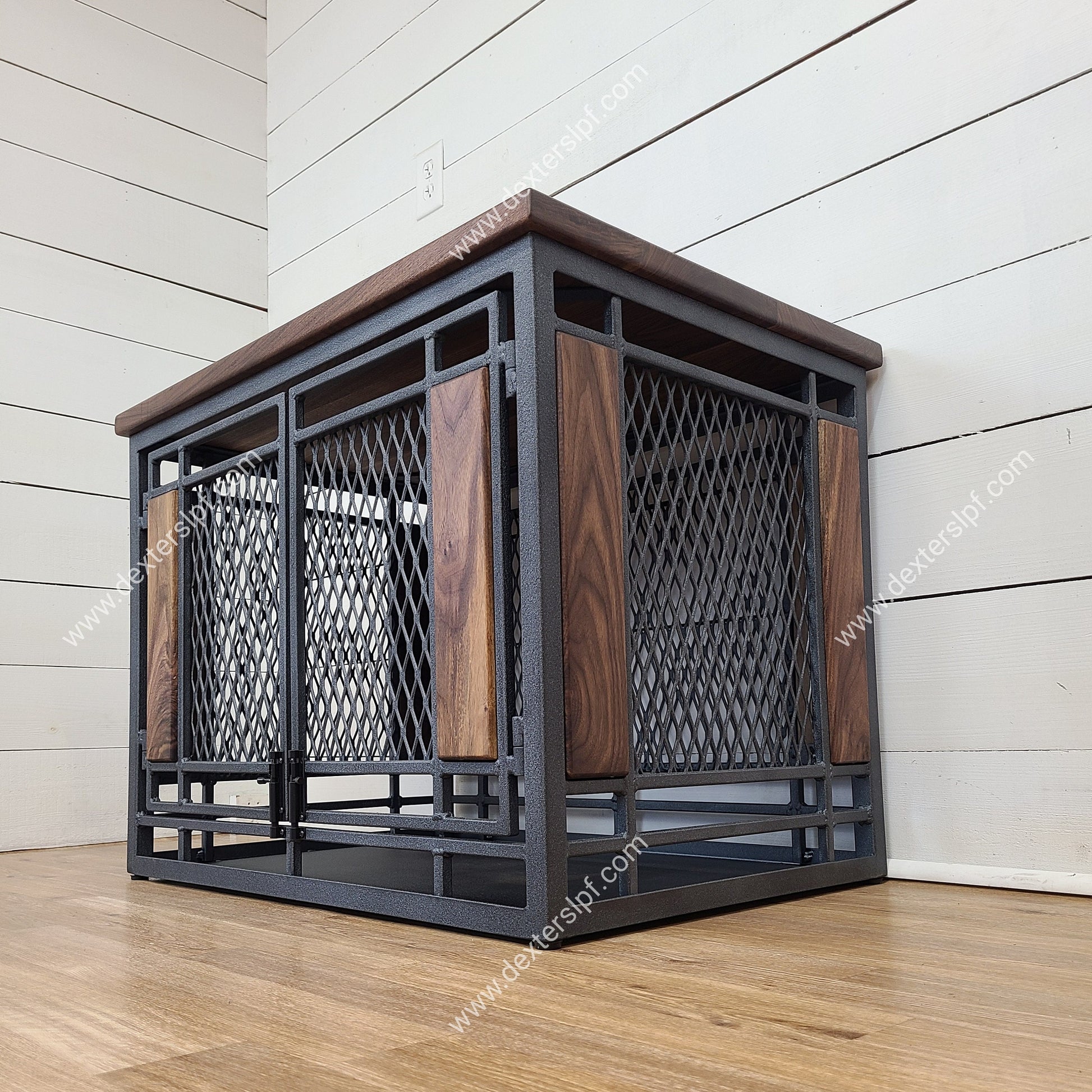 Introducing the Raven Medium Modern Dog Crate, a perfect blend of style, craftsmanship, and functionality for your beloved pet. This sleek and sophisticated dog crate furniture serves as a stunning statement piece and conversation starter in any room. Designed with an industrial modern aesthetic, it features expanded metal panels and black walnut accents that add elegance to its sturdy steel construction.