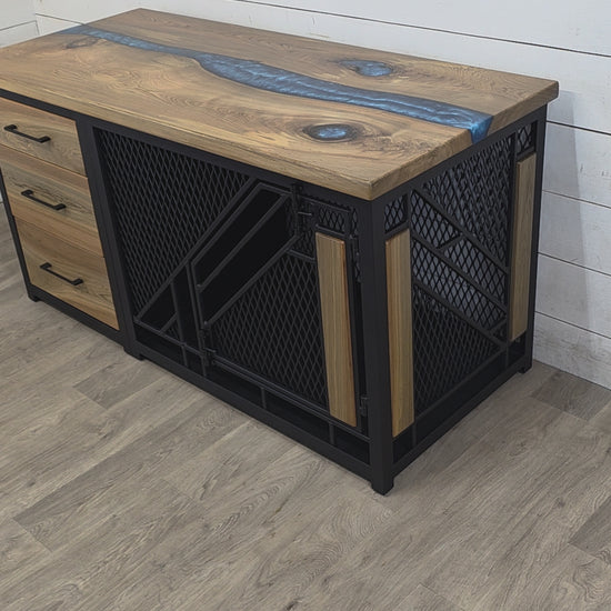 Remy Large Dog Kennel with Drawers and Epoxy River Table Top | Live Edge Wood Luxury Pet Furniture