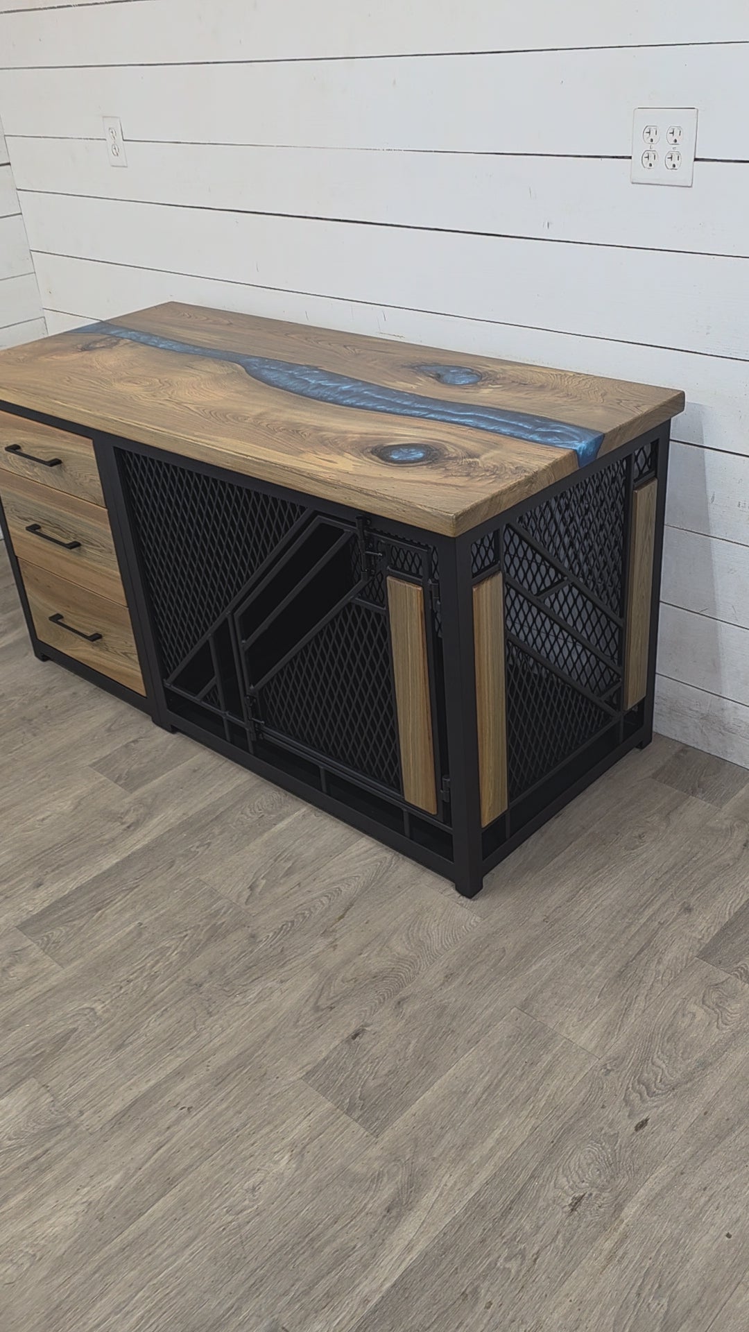 Each kennel is made to order, allowing for customization of wood species, epoxy color, and metal finish.