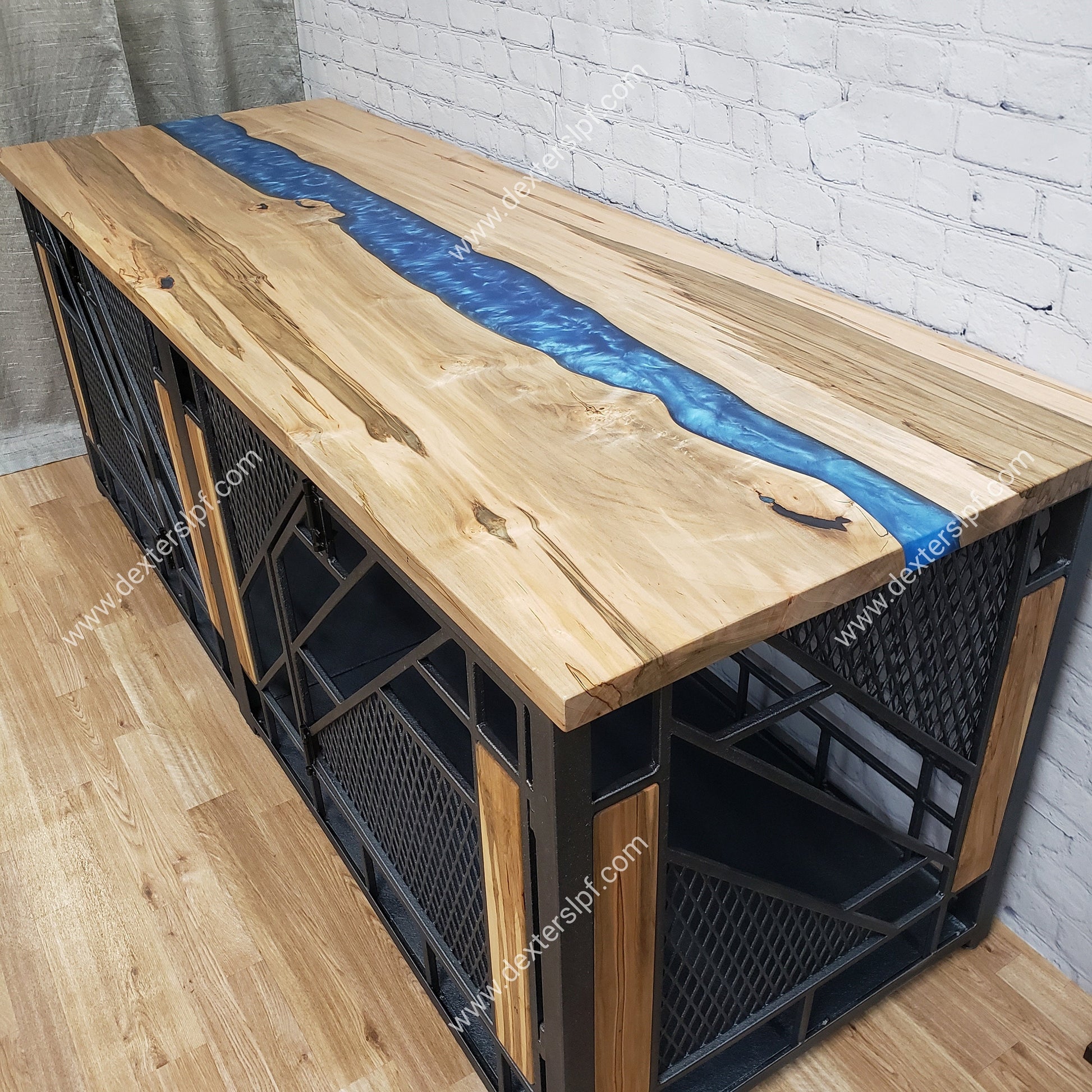 Crafted from Ambrosia Maple and Blue Ecopoxy, the top is sealed for a long-lasting finish, offering both beauty and functionality. -